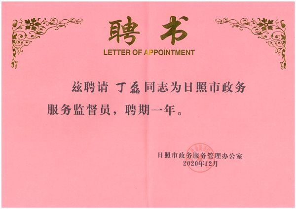 2020年12月3日,日照市政府服務(wù)管理辦公室、日照市行政審批服務(wù)局舉行日照市政務(wù)服務(wù)監(jiān)督員聘任儀式及政府開(kāi)放日活動(dòng),公司董事、行政總監(jiān)丁磊被聘為日照市政務(wù)服務(wù)監(jiān)督員。